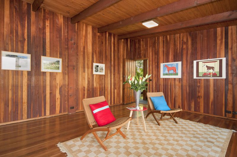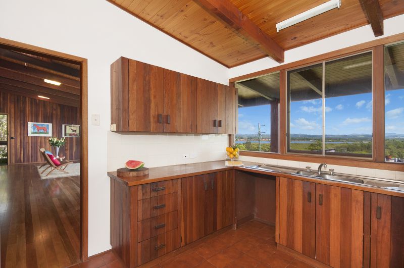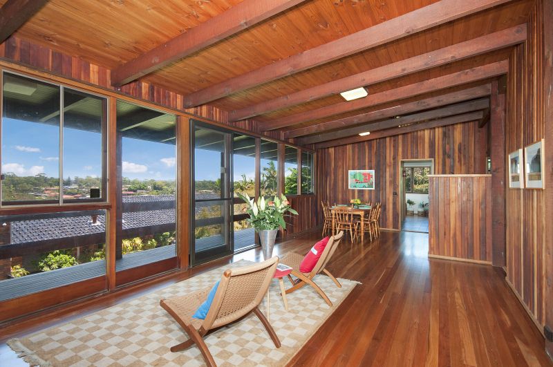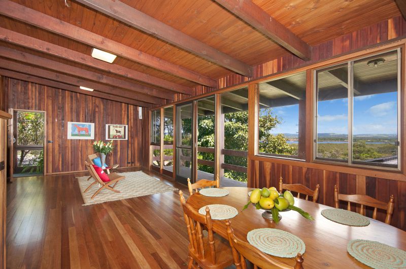 Rare Rosewood timber has been used to line the walls of the relaxed living and dining with floor to ceiling glass doors opening onto spacious sundrenched decks overlooking picturesque North Creek and beyond.