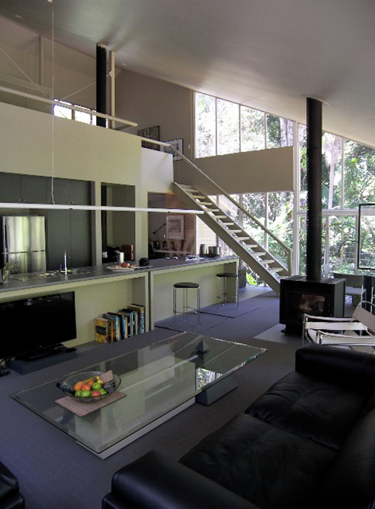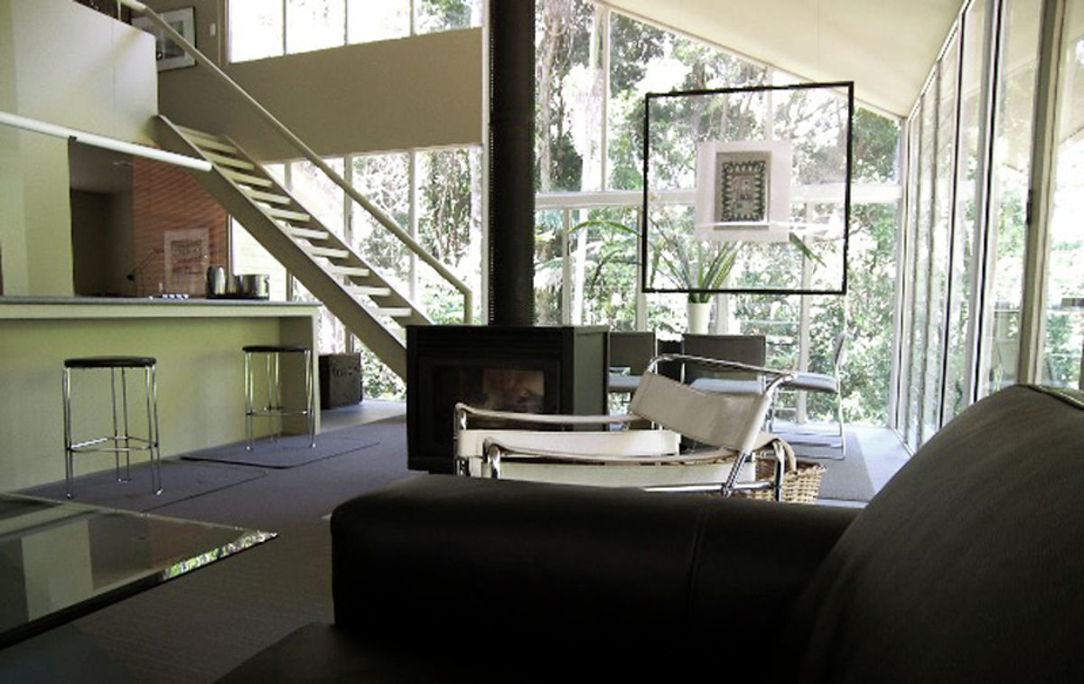 Although of a different configuration to the main house, the guest house shares the same "treehouse" design elements. With two internal levels to provide privacy and comfort, there is an enclosed wood burning stove providing warmth in winter, plus there are plenty of adjustable louver windows to allow cross flow for coolness in summer.