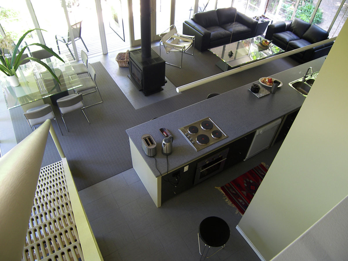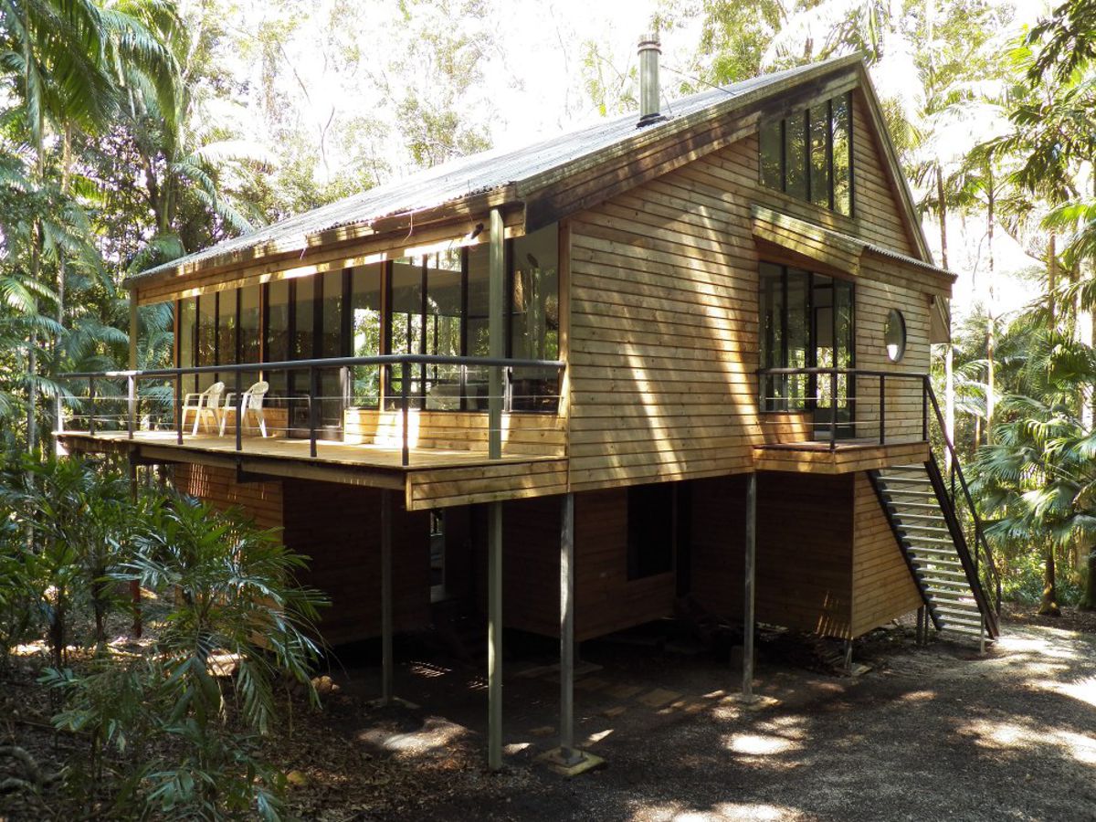 Although of a different configuration to the main house, the guest house shares the same "treehouse" design elements. With two internal levels to provide privacy and comfort, there is an enclosed wood burning stove providing warmth in winter, plus there are plenty of adjustable louver windows to allow cross flow for coolness in summer.