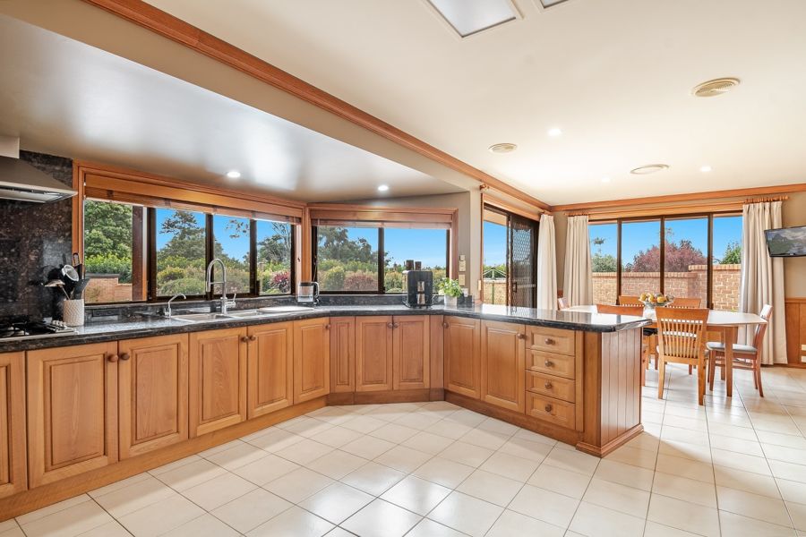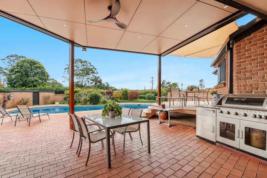 As you step inside, the first thing you'll notice is the abundance of natural light. The living and dining areas feature soaring raked ceilings with exposed artisan brickwork, cool tiled floors, and an expansive sense of space that invites relaxation and entertaining. The open-plan kitchen is a chef's dream, with quality appliances, a walk-in pantry, and timeless timber paneling and exposed brick that embrace the rural charm of the home. Meals can be enjoyed in the formal dining room or more casually on the sun-drenched deck, overlooking the saltwater pool.