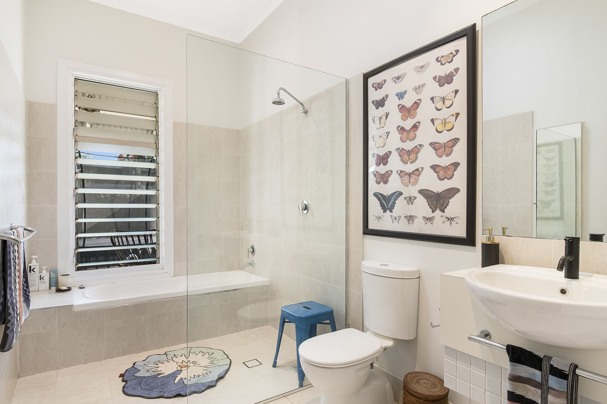 Throughout the sun-soaked interior, a keen eye for detail has been applied. From the large entry way chandelier, 12 foot ceilings, pressed metal and dado detail wood, to the cut out airflow detailing above the doors, every design decision is considered and tasteful. Outdoors, the modern, relaxed style continues. The low maintenance 10m x 5m Ozone salt water pool has a 3m shallow step, ideal for kids. There is also an Ozone spa and infrared sauna. The back courtyard with a private outdoor shower and bath and fully fenced dog yard leads to the four raised bed vegetable gardens growing dragon fruit, passion fruit and herbs.