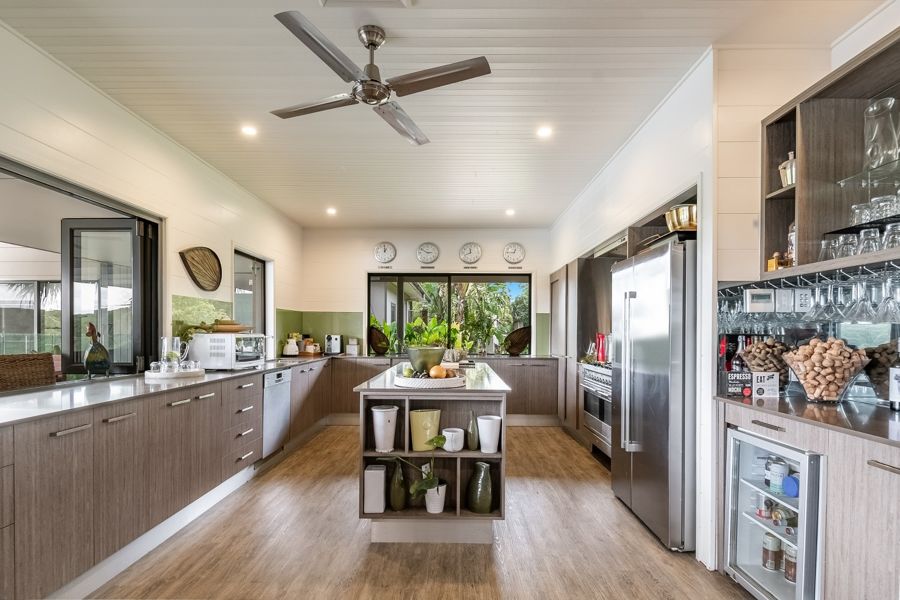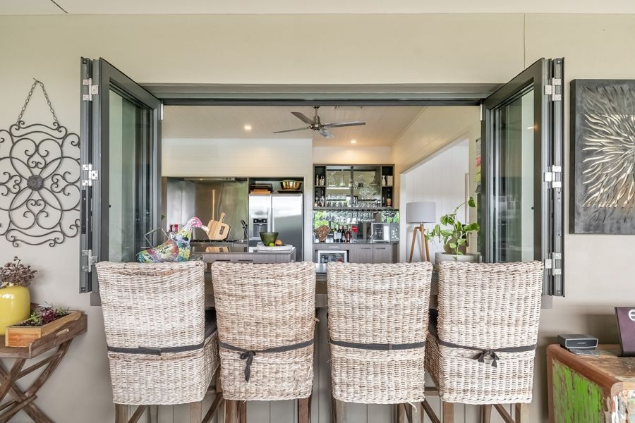 The main residence features a modern, open-plan living design with a high-quality chef's kitchen with stone bench tops, a kitchen island bench. An outdoor servery from the kitchen opens out to the stylish al fresco dining and entertaining area with all living spaces overlooking the sparkling 17- metre in ground lap pool.