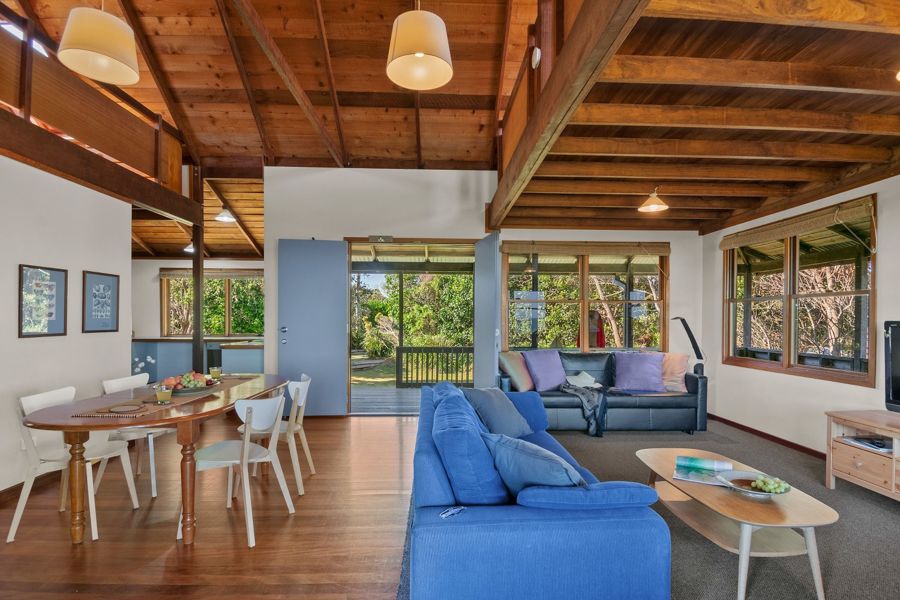 This spacious one-bedroom, one-bathroom beach house includes an open plan living, dining, kitchen area with a covered veranda wrapping around three sides.