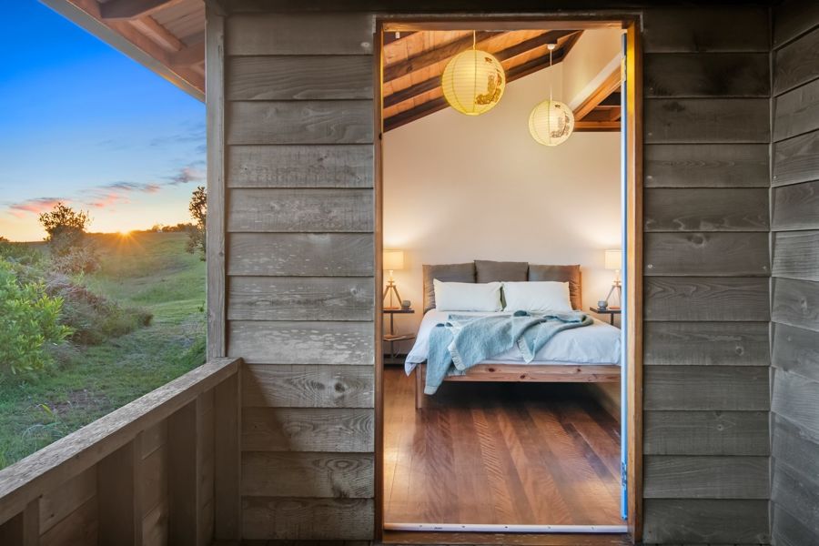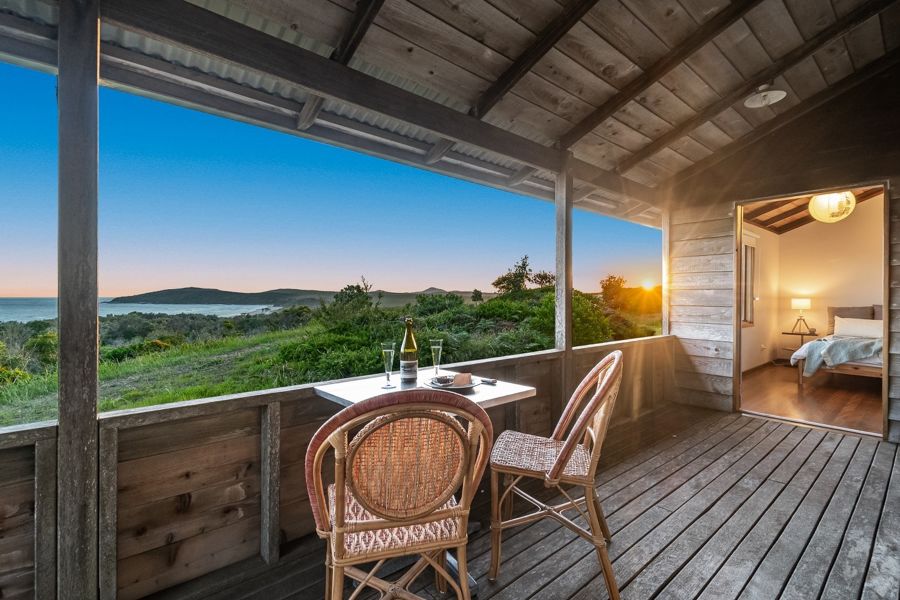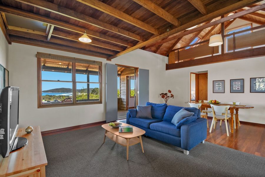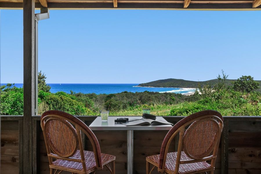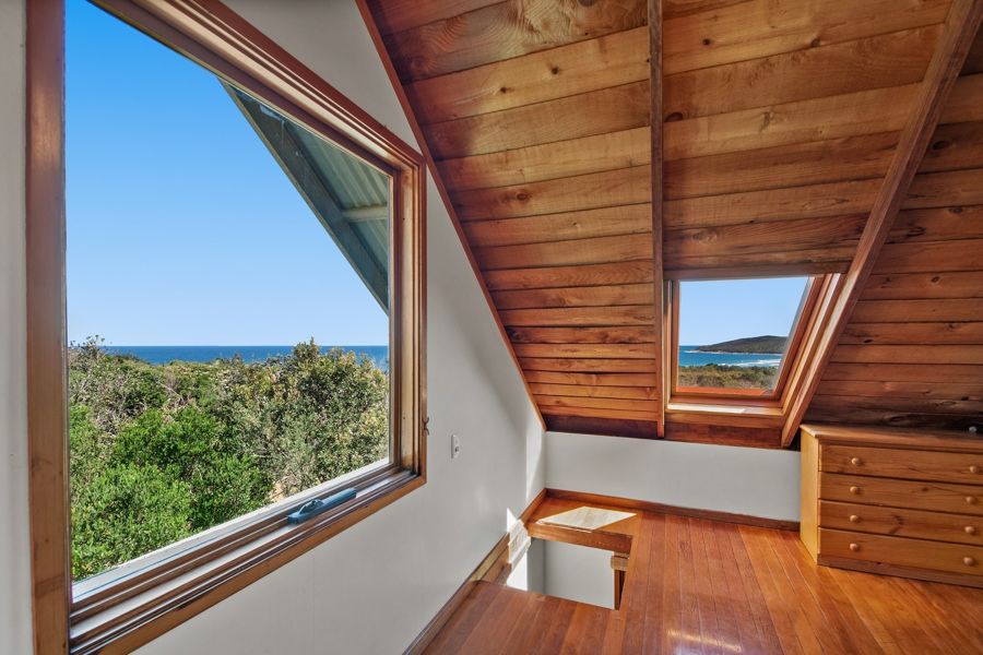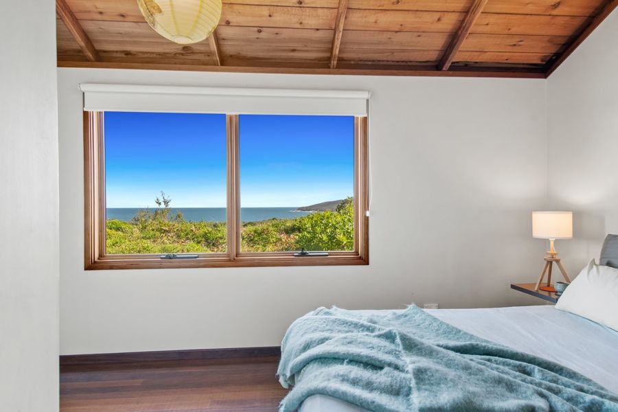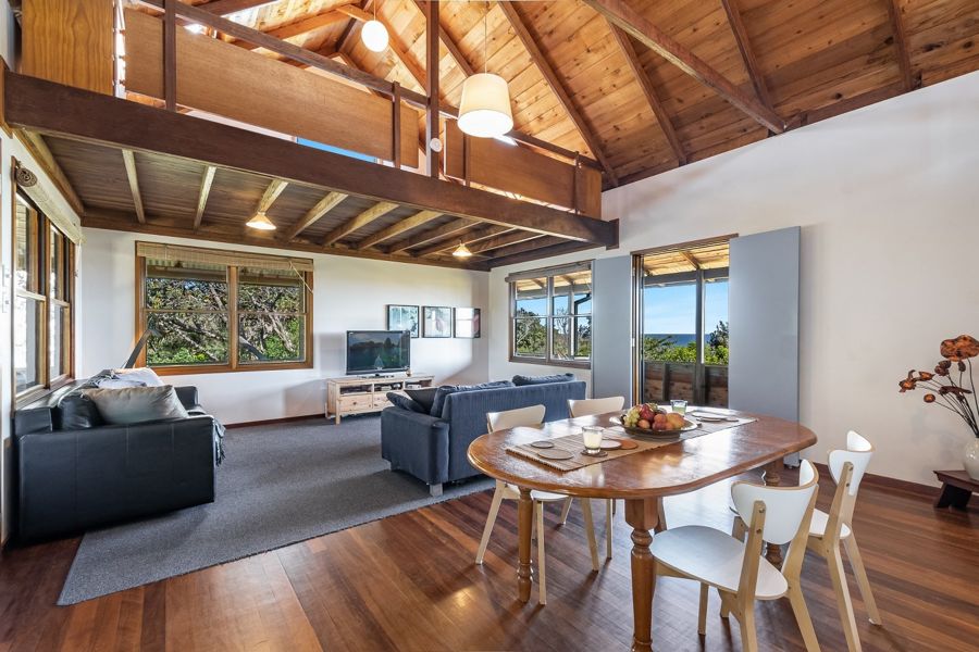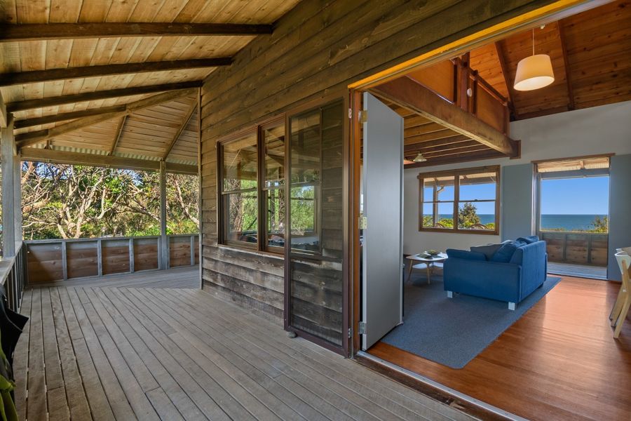 The bedroom also has brush box floors, a cedar ceiling, cedar windows with sweeping views over Angourie Bay and Yuraygir National Park and French doors opening onto the veranda.
