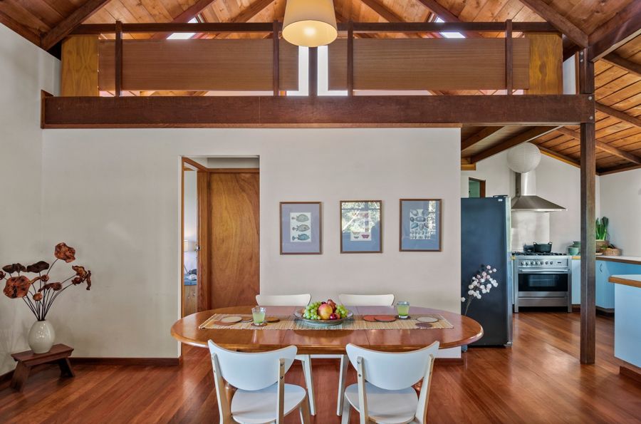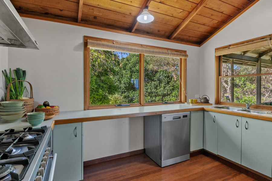 Inside, the large and spacious living area flows to the original kitchen (3.6 x 3.6) featuring stainless steel appliances such as the 900mm Blanco gas cooktop/electric oven. Like the rest of the home the kitchen has brush box floors, cedar ceilings and offers spectacular views over the garden and entry.