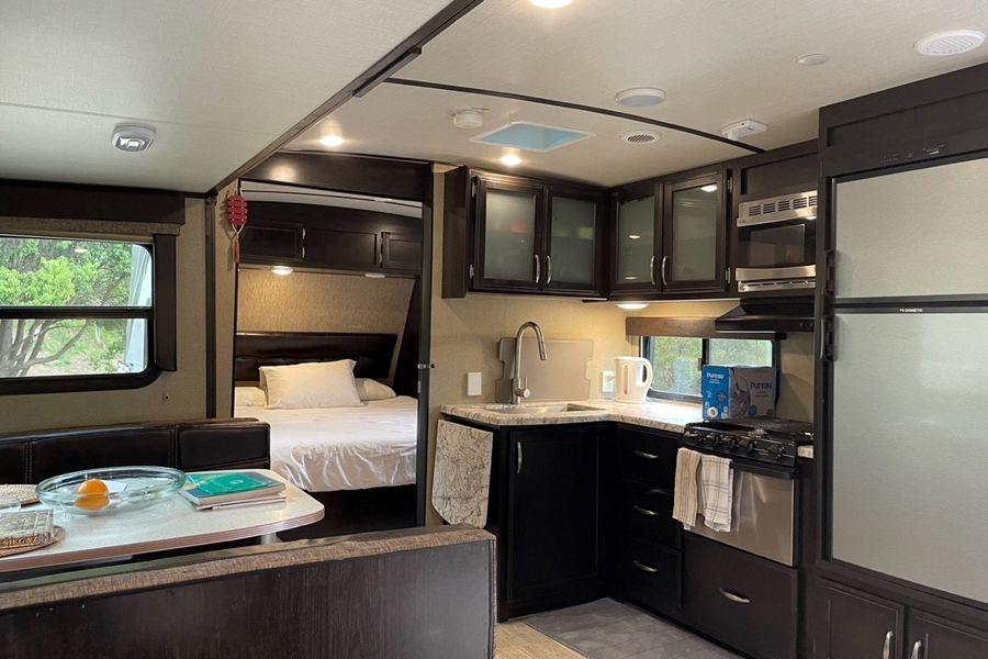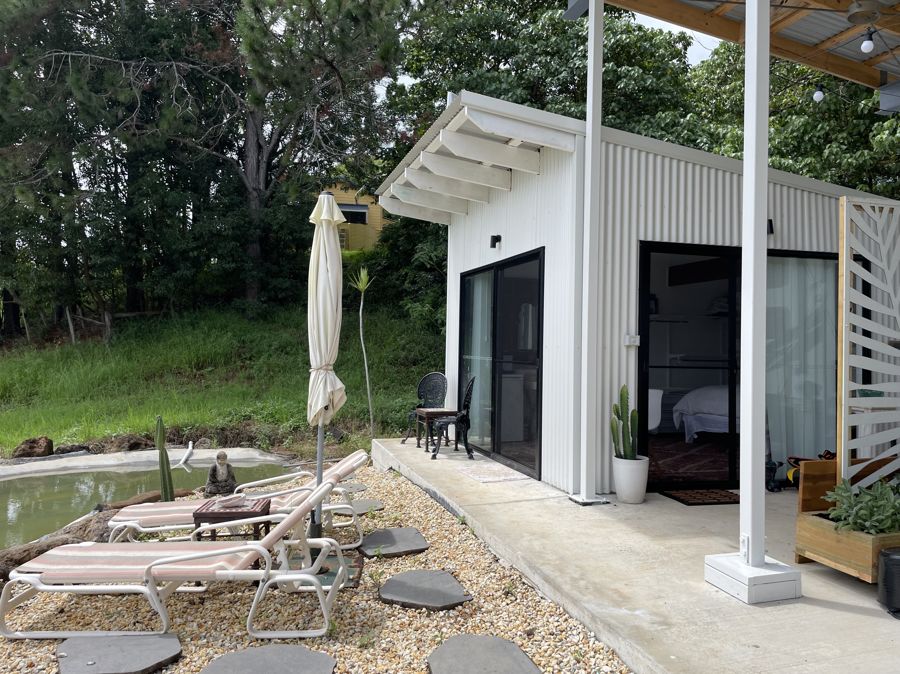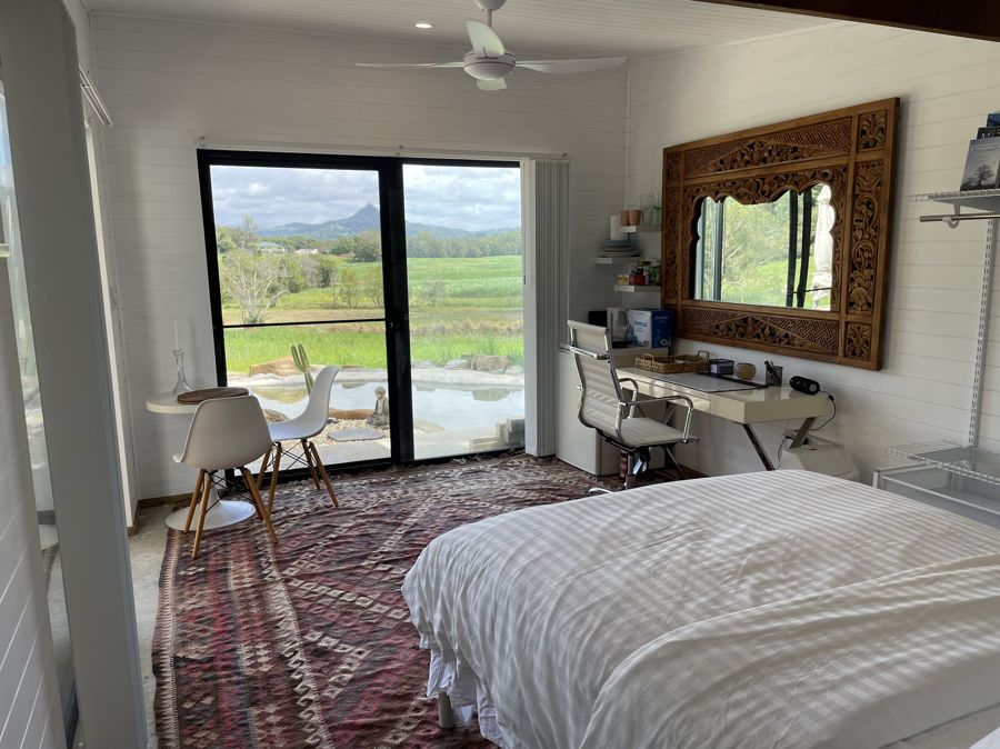 The Luxury Caravan + Studio - a fully self-contained, 32 ft luxury caravan, complete with its own ensuite, rock pool, and easily maintained landscaping. Fully connected to water, septic, and electricity, it provides all the comforts of home, including two recliners and a flat-screen TV. Whether it's extra accommodation or a unique vacation experience, it's the ultimate addition to this already remarkable property.