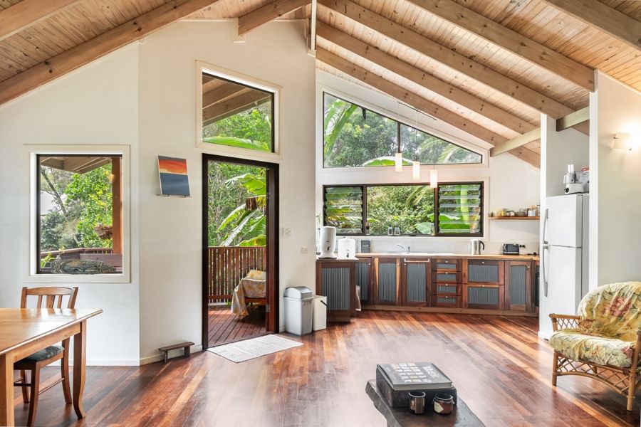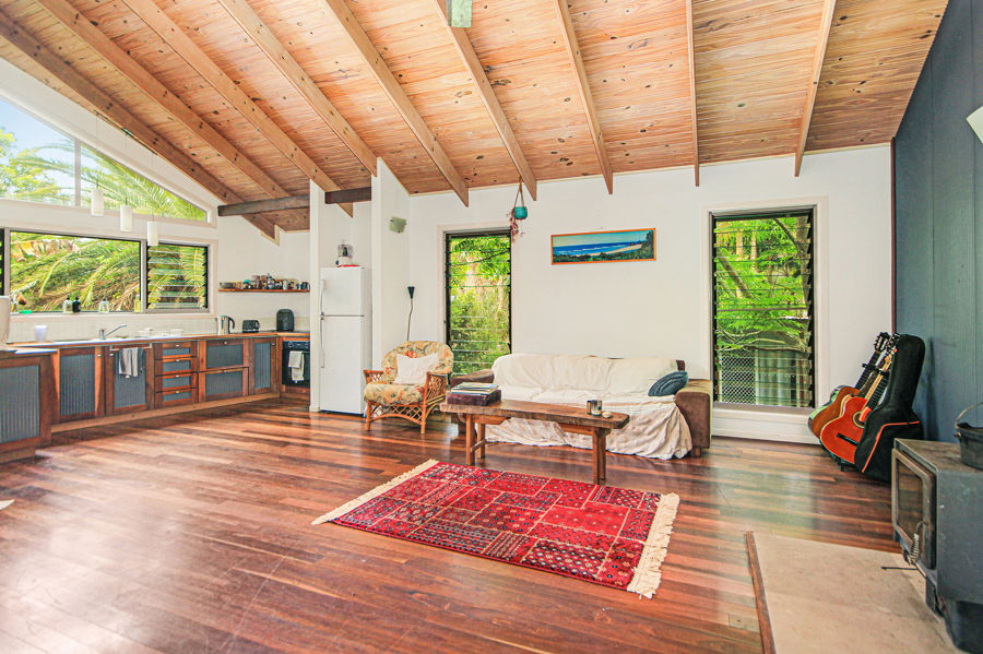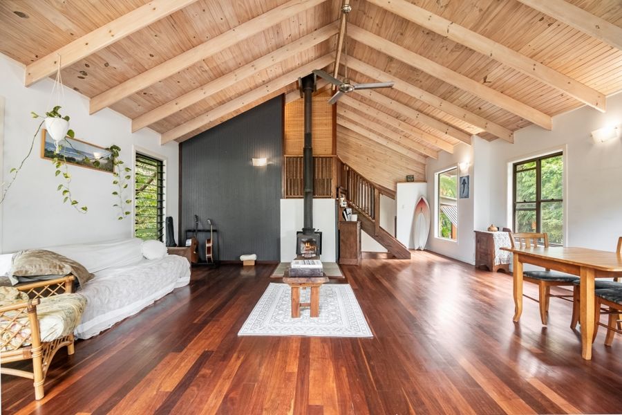Welcome to your sanctuary in South Golden Beach, where nature's embrace beckons you home. This charming 2-bedroom, 2-bathroom dwelling boasts an open-plan design adorned with cathedral ceilings and warm timber flooring, epitomizing rustic elegance.