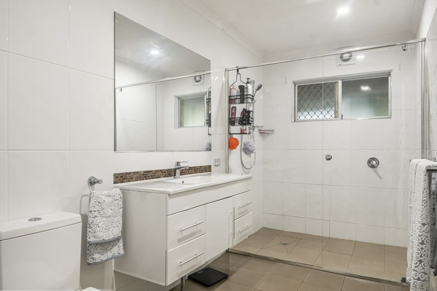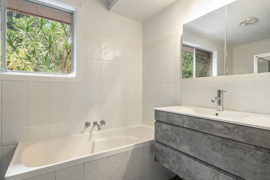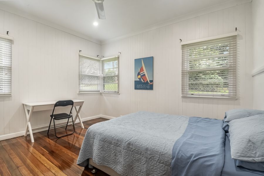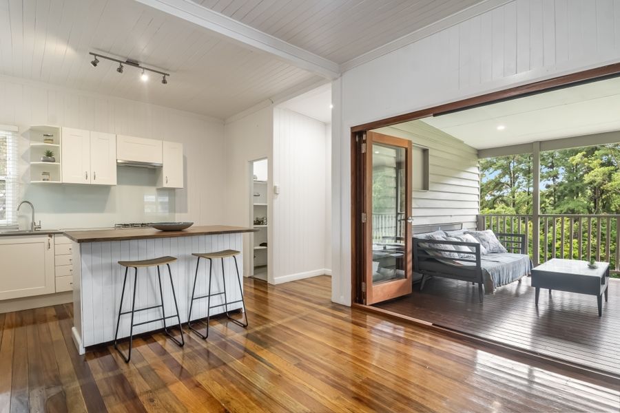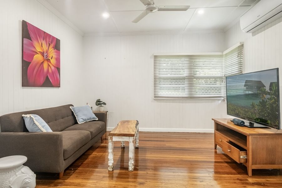 The second home, a stylish Queenslander, offers two bedrooms, 1.5 bathrooms, and an open-plan kitchen and dining area with high ceilings, reverse cycle air conditioning, timber flooring, and a breezy verandah with ceiling fans. Ideal for grandparents, guests, or rental income, providing complete independence.