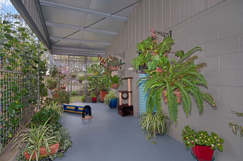 The Cattery is surrounded by lovely lawns, tall trees and landscaping and consists of 10 cat pens, all with mezzanine levels allowing the cats to climb. A contained 'jungle' area is set aside for the cats to hide or explore, another scratching pen and a clean modern utility room for equipment and food storage.