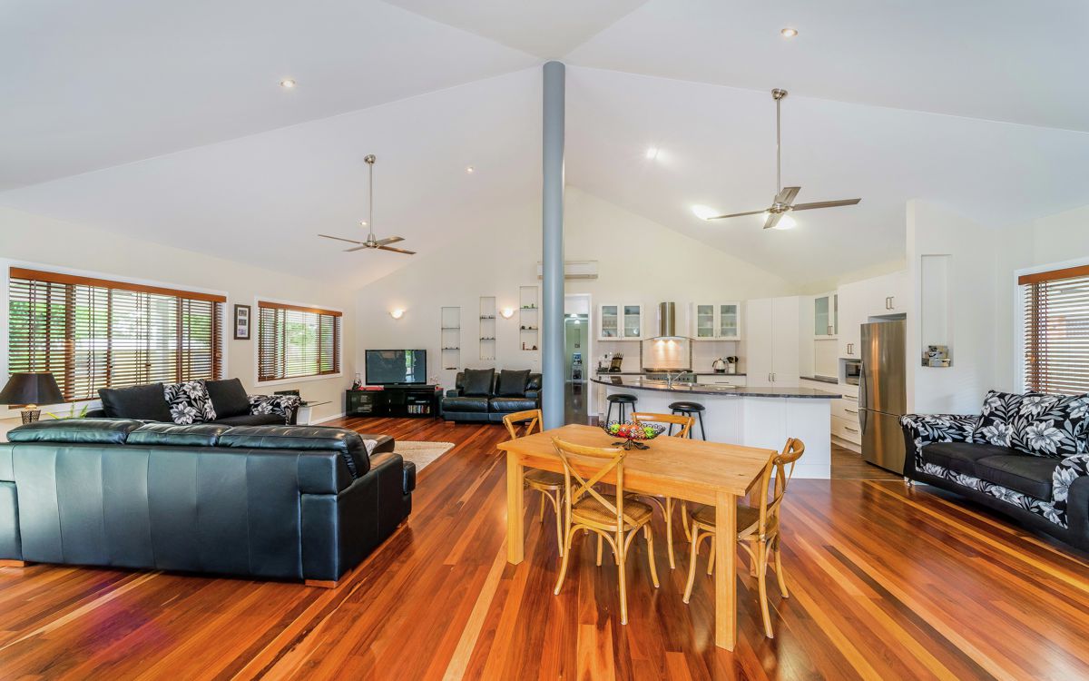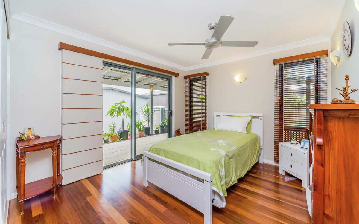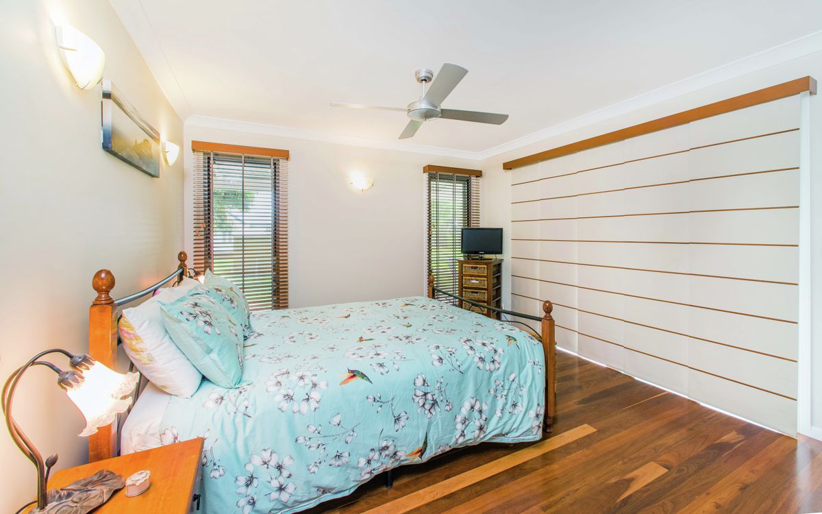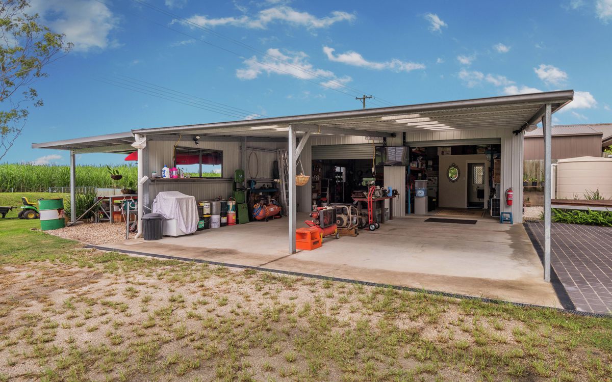 The rear of the home is the ultimate in privacy with a view over the cane fields to the mountains in the North East and the welcoming summer breezes. Here the 'Man of the House' has been well attended to with a fabulous double shed including twin carports....bathroom...TV outlets to watch the footy...drive through backyard for the caravan ...and.....a lock up separate garage and carport for the ride-on mower and other men essentials!!