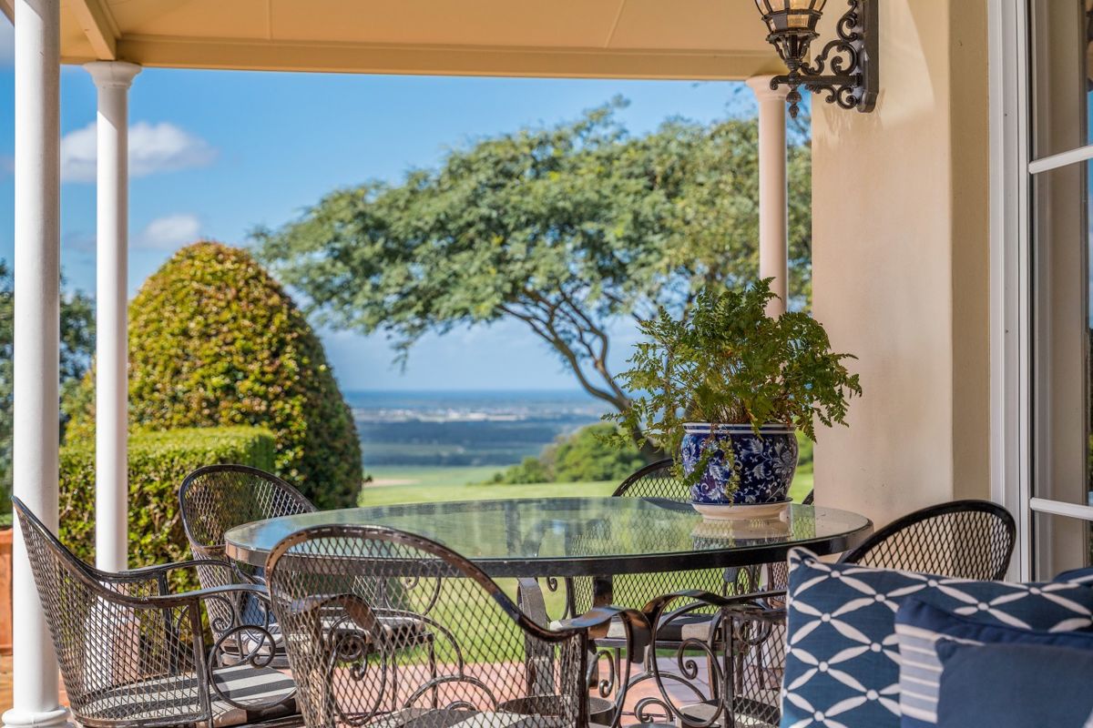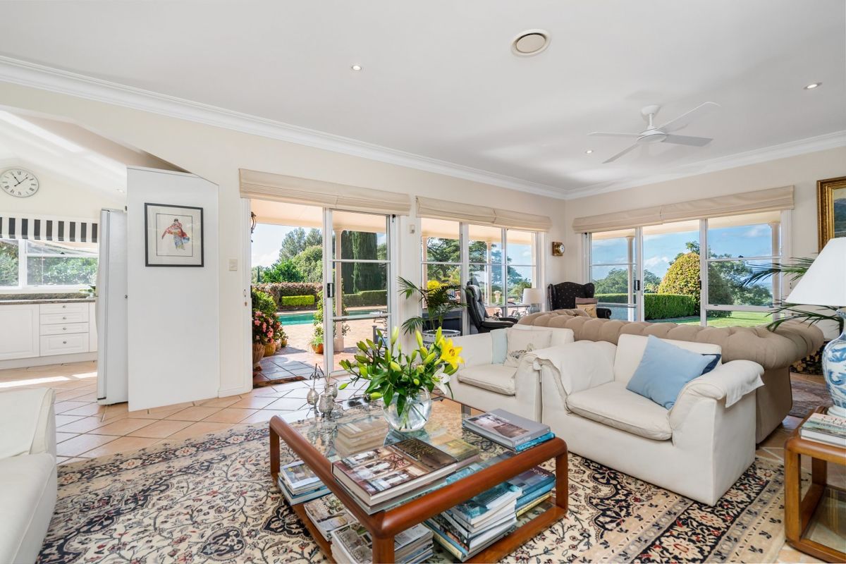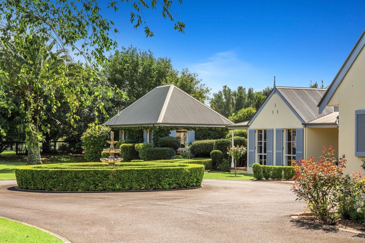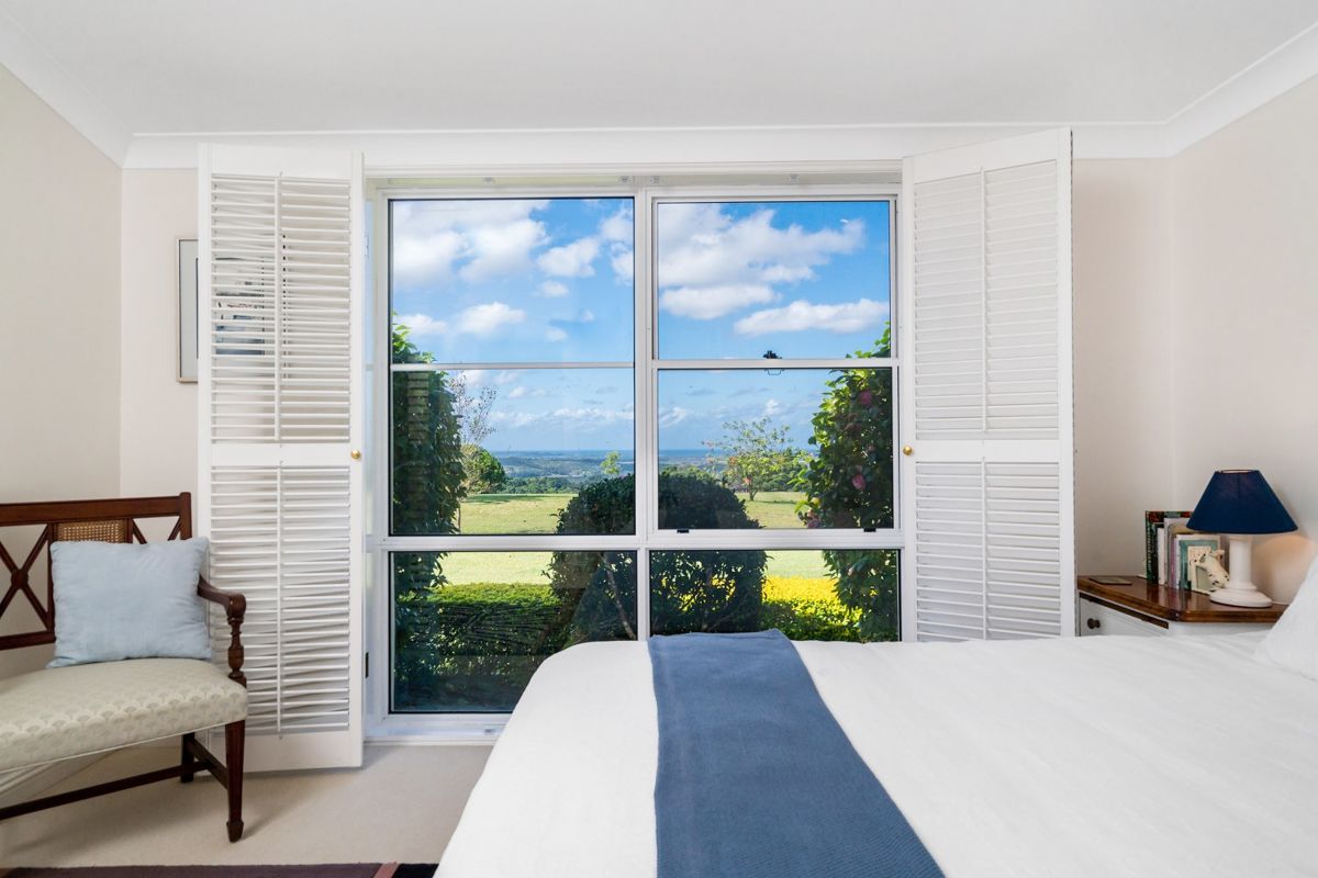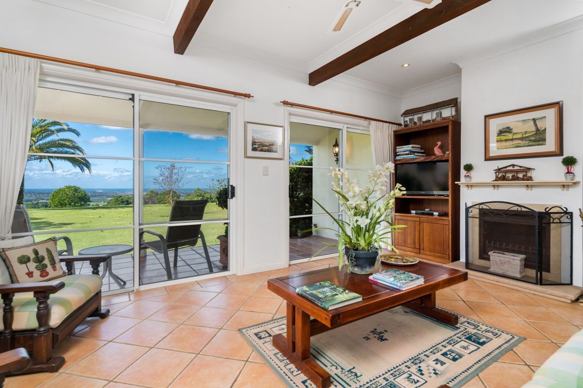 Picture windows increase air and light flow and offer views over the established formal gardens, pool and farmland below.