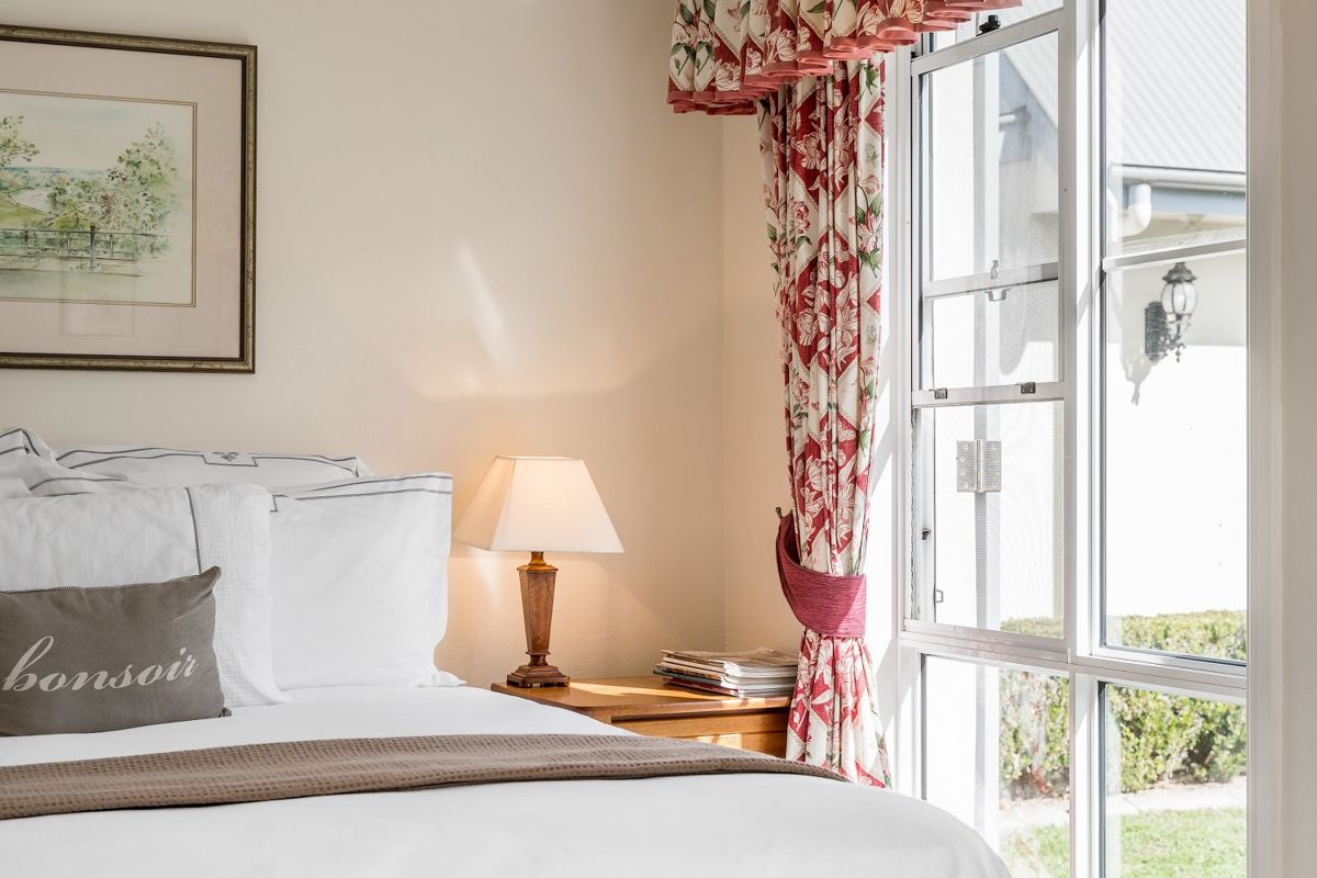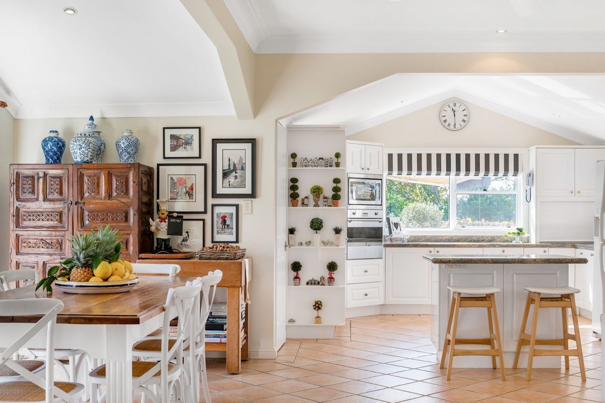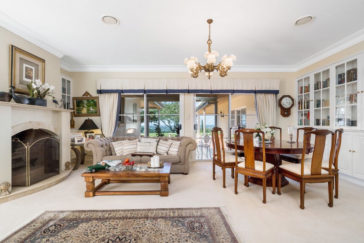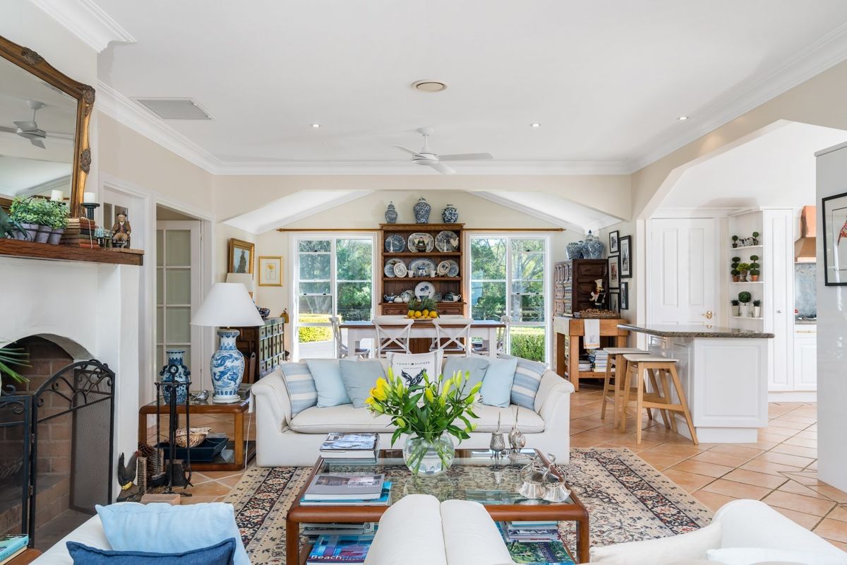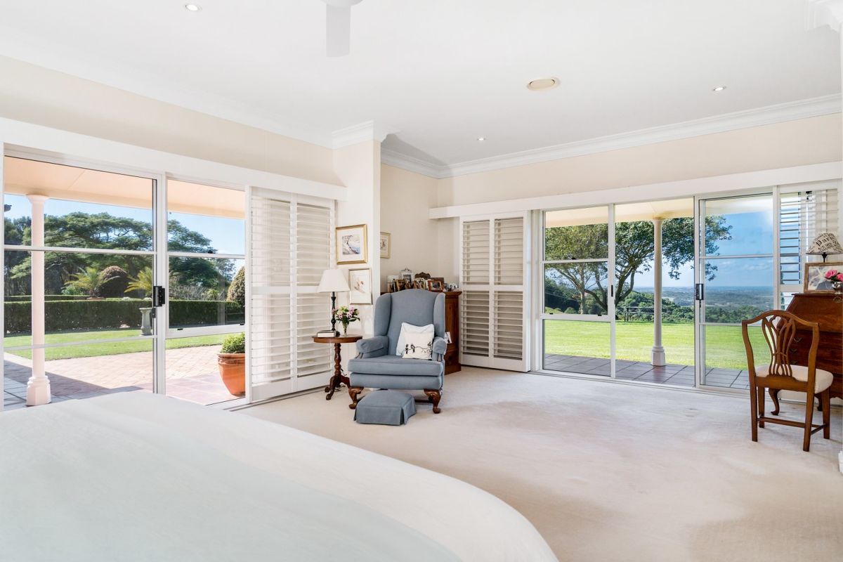 Picture windows increase air and light flow and offer views over the established formal gardens, pool and farmland below.