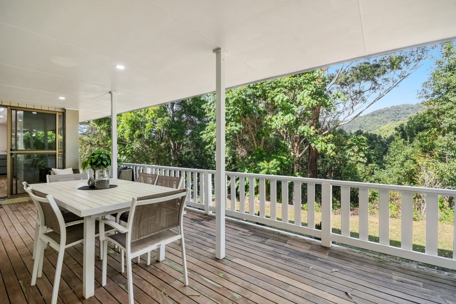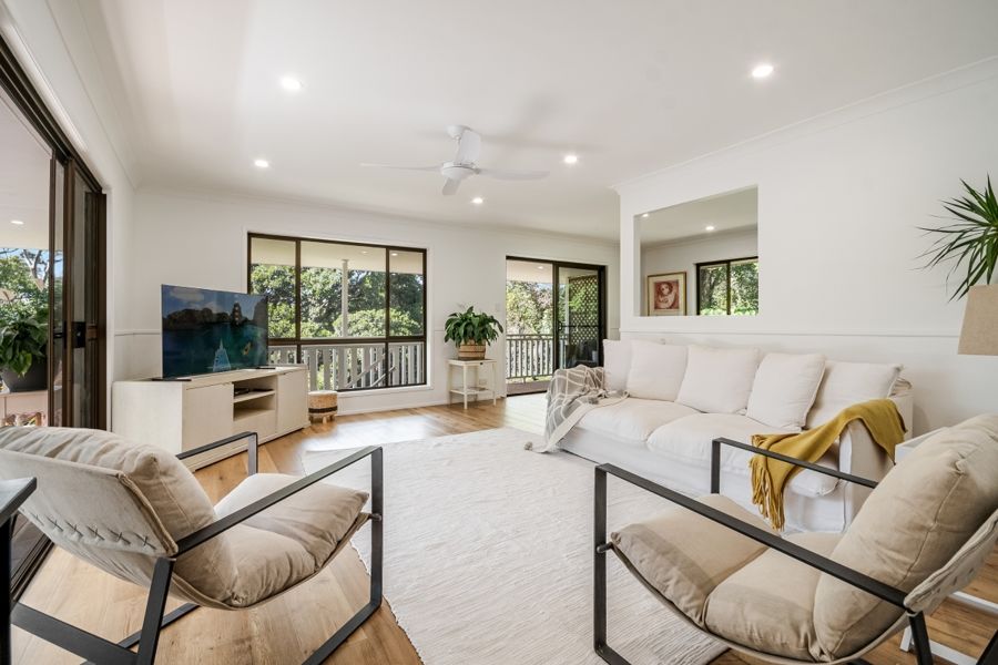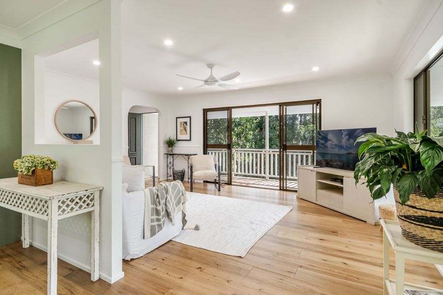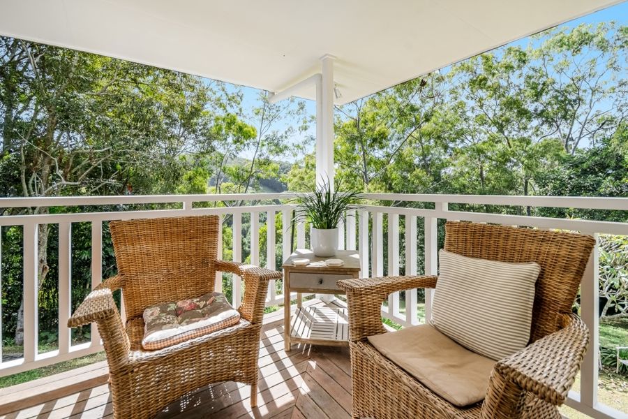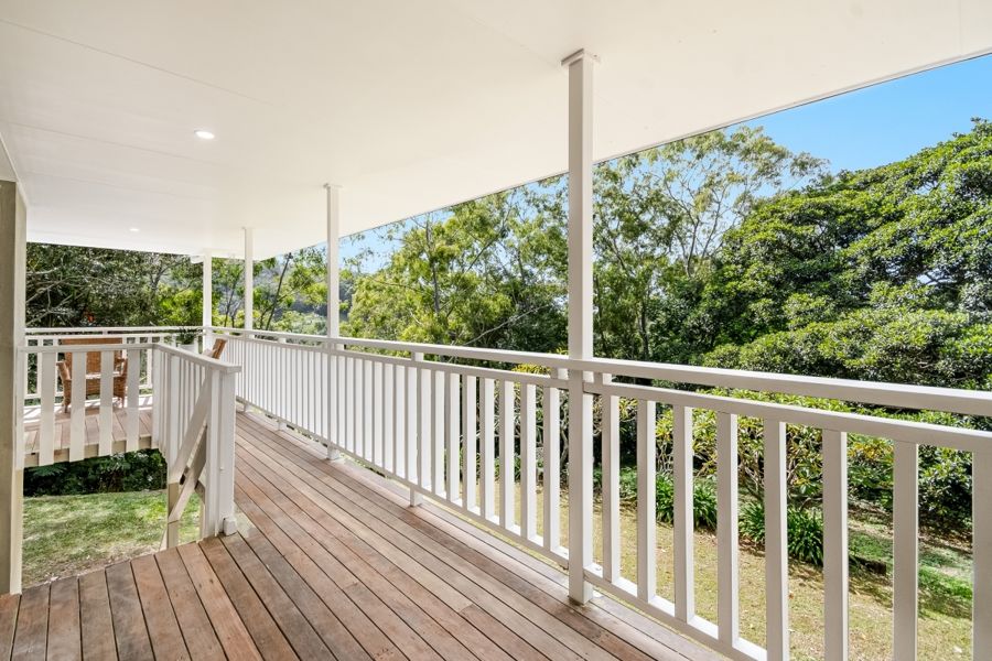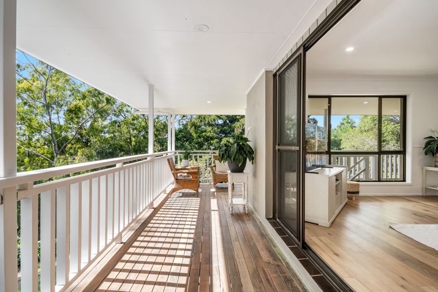 This stunning, recently refurbished home is the epitome of modern luxury. The elevated 3 bedroom, 2 bathroom home offers open plan living, featuring a chef's kitchen with stone bench tops and modern appliances including an induction cooktop and one and a half wall oven. The walk-in pantry offers ample storage space with the open plan living and kitchen conveniently opening to the covered verandahs and decks, creating a seamless indoor-outdoor living experience. Natural light abounds with carefully designed skylights throughout. The verandahs provide breathtaking views of the surrounding landscape, making it the perfect place to relax and entertain. Perched elegantly on a hill, (with no flood risk), the ideal north-east aspect invites abundant sunshine and always catches the gentle breeze.