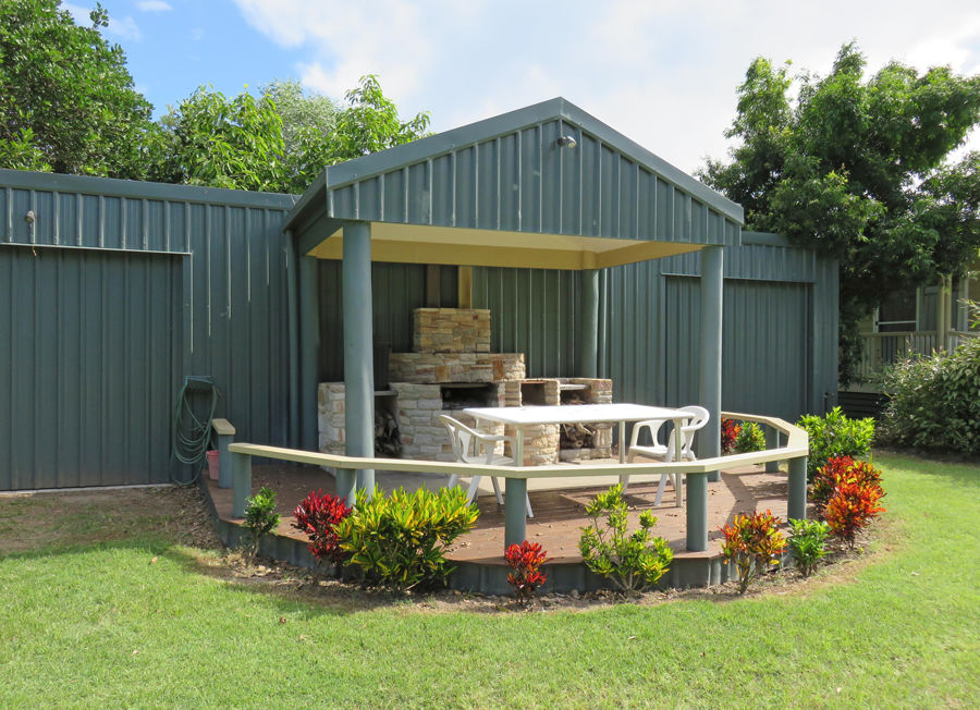 The cottages share a large, covered gazebo, surrounded by lush sub-tropical gardens. The gazebo overlooks the river and features a purpose-built sandstone wood-fired BBQ, a separate meals area.